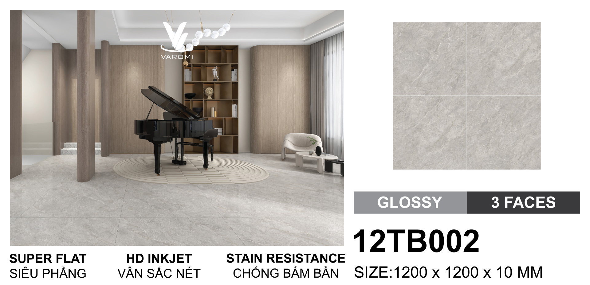 Một buổi chiều, khi ánh nắng xuyên qua lớp rèm trắng tinh khôi, không gian phòng khách bỗng trở nên ấm áp và sang trọng đến lạ. Chủ nhân ngôi nhà mỉm cười khi bước chân trần trên nền gạch xám nhẹ, cảm nhận sự mát lạnh dễ chịu và bề mặt siêu phẳng hoàn hảo. Đó chính là khoảnh khắc gạch 12TB002 của Varomi biến căn phòng từ bình thường thành tác phẩm nghệ thuật sống động.