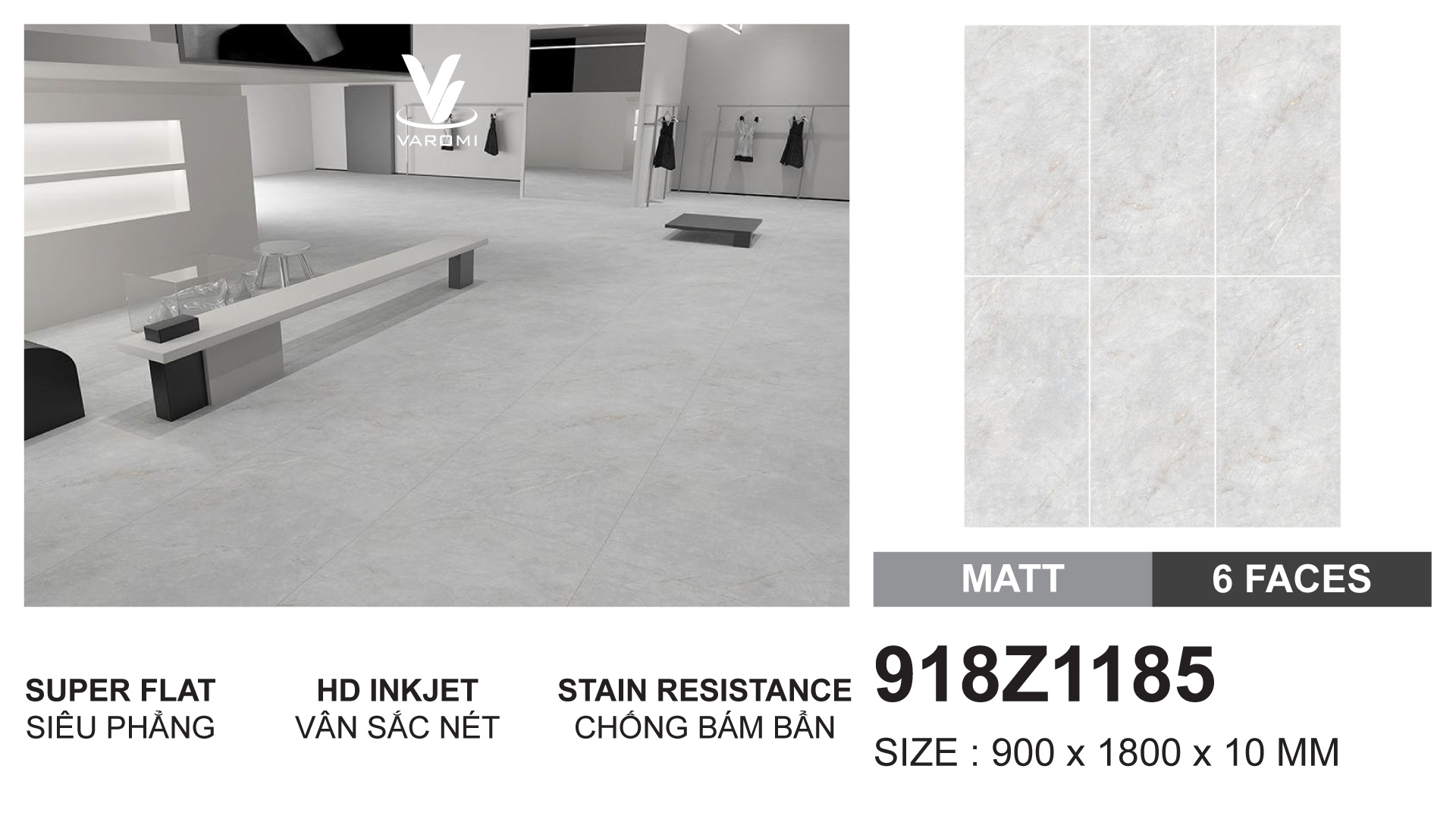 Lấy cảm hứng từ những mảng đá tự nhiên, gạch 918Z1185 sở hữu gam màu xám sáng trang nhã, kết hợp với những đường vân mờ tinh tế. Bề mặt Matt hiện đại giúp không gian trở nên thanh lịch, tối giản nhưng vẫn tràn đầy cảm giác rộng mở và thoáng đãng.