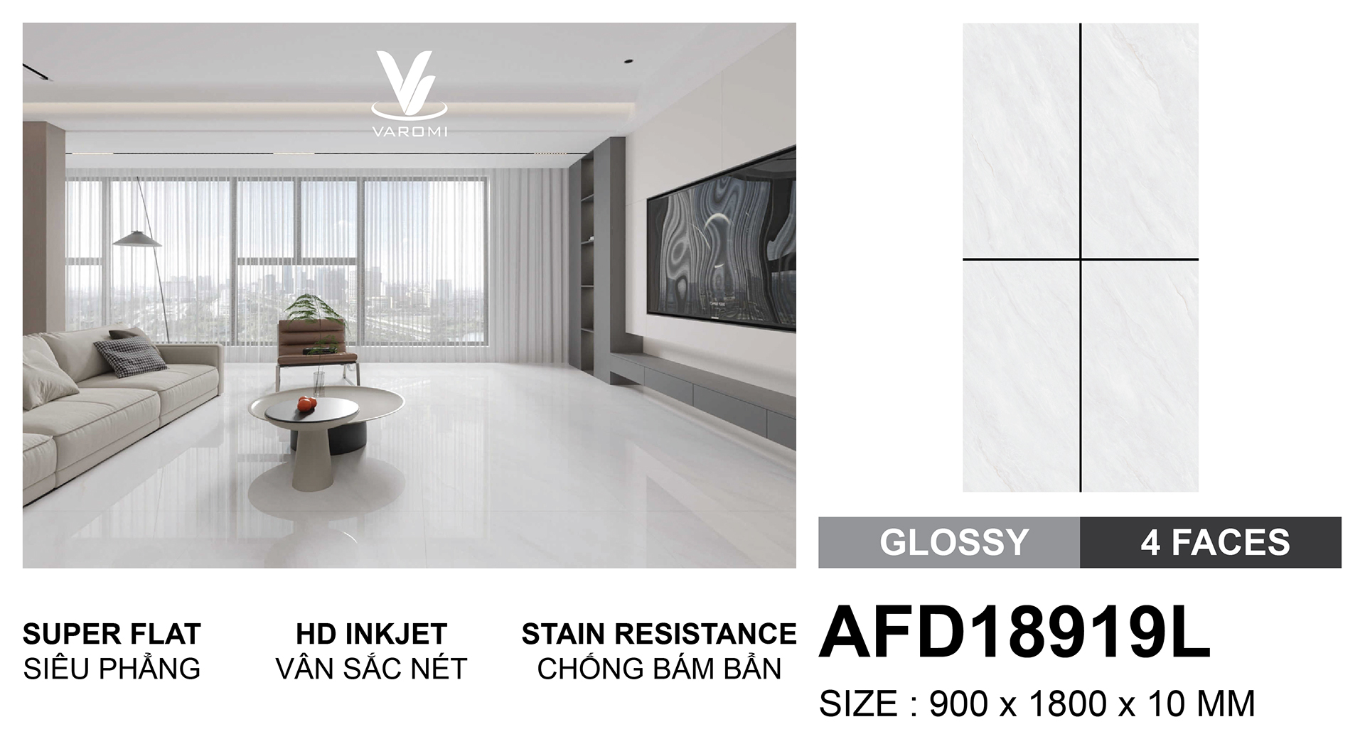 Mang lại sự sung sướng: Bước vào phòng khách lát gạch AFD18919L, gia chủ cảm nhận ngay sự đẳng cấp – hiện đại – sang trọng.