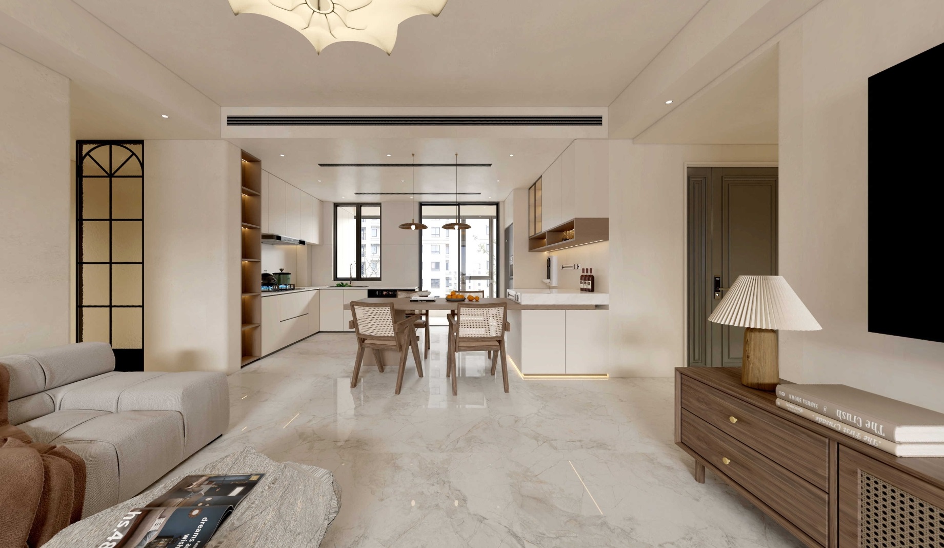 Nhìn vào bức ảnh phối cảnh, có thể thấy gạch AFD189310 kích thước 900x1800mm đã tạo nên một phòng khách liền bếp rộng rãi, thoáng đãng và tràn đầy ánh sáng.
