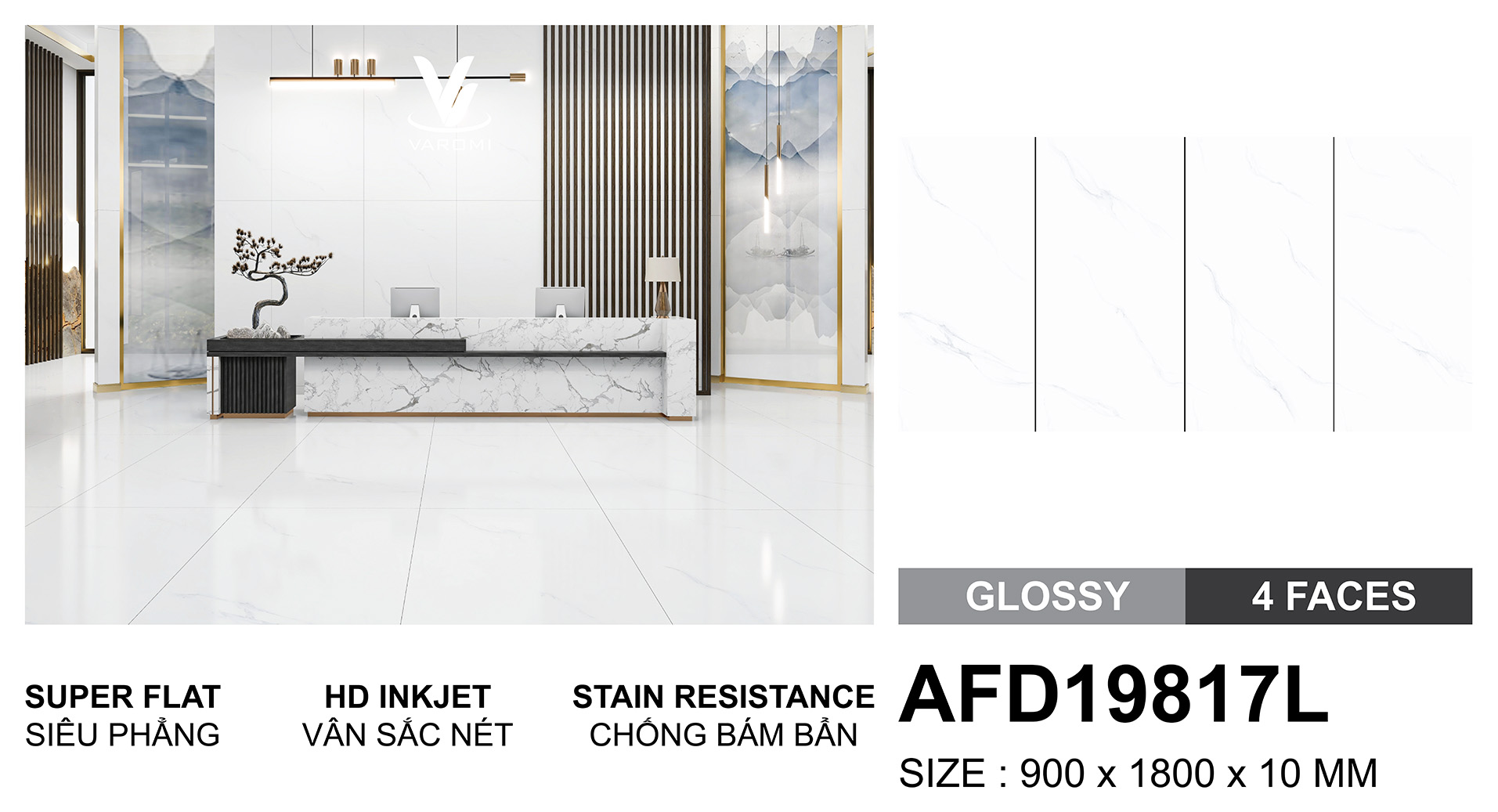 Trong thế giới thiết kế nội thất hiện đại, sự lựa chọn gạch ốp lát không chỉ đơn thuần là vật liệu xây dựng, mà còn là tuyên ngôn về phong cách sống. Mẫu gạch AFD19817L (900x1800mm, dày 10mm, bề mặt bóng) của Varomi chính là đại diện hoàn hảo cho sự kết hợp giữa thẩm mỹ và công năng – một lựa chọn tinh tế cho những không gian cao cấp.