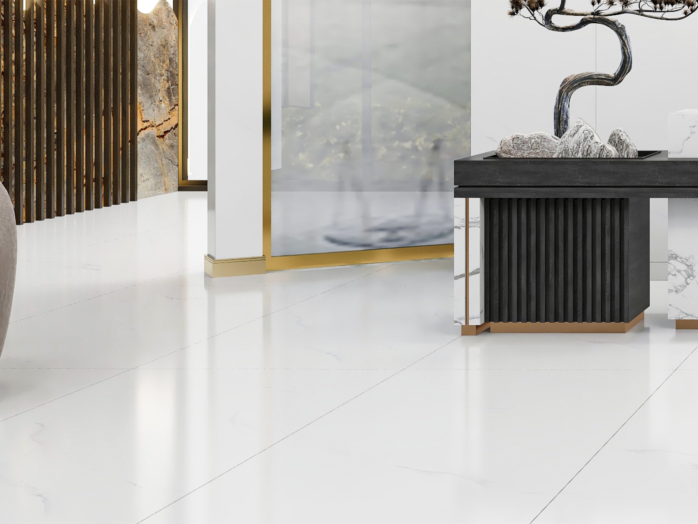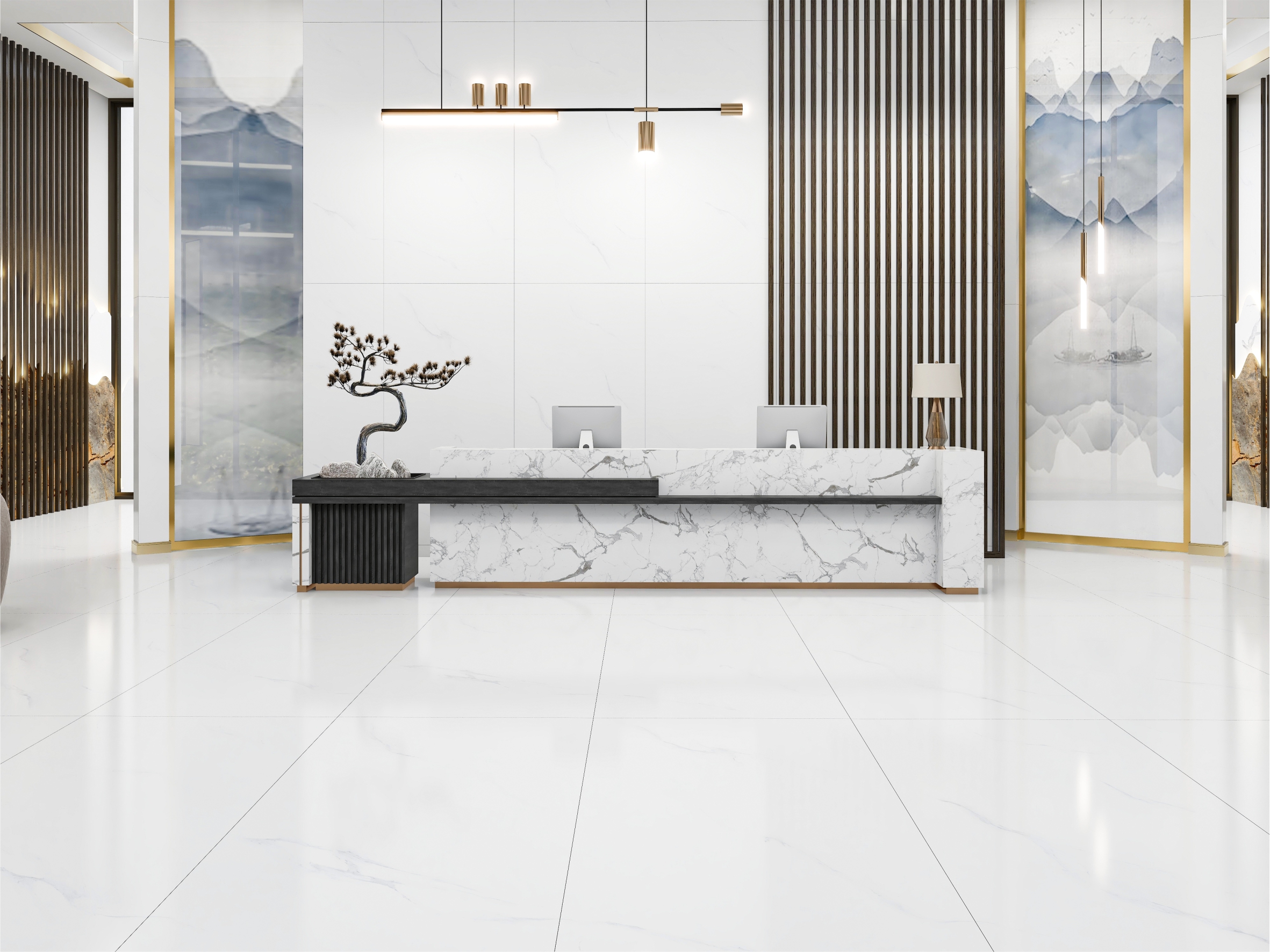 Hình ảnh không gian sảnh lễ tân với gam trắng chủ đạo, xen lẫn vân mảnh tinh tế, đã chứng minh rằng: chỉ cần một lựa chọn gạch đúng, cả không gian bừng sáng với vẻ đẹp thanh lịch, hiện đại nhưng vẫn ấm áp.