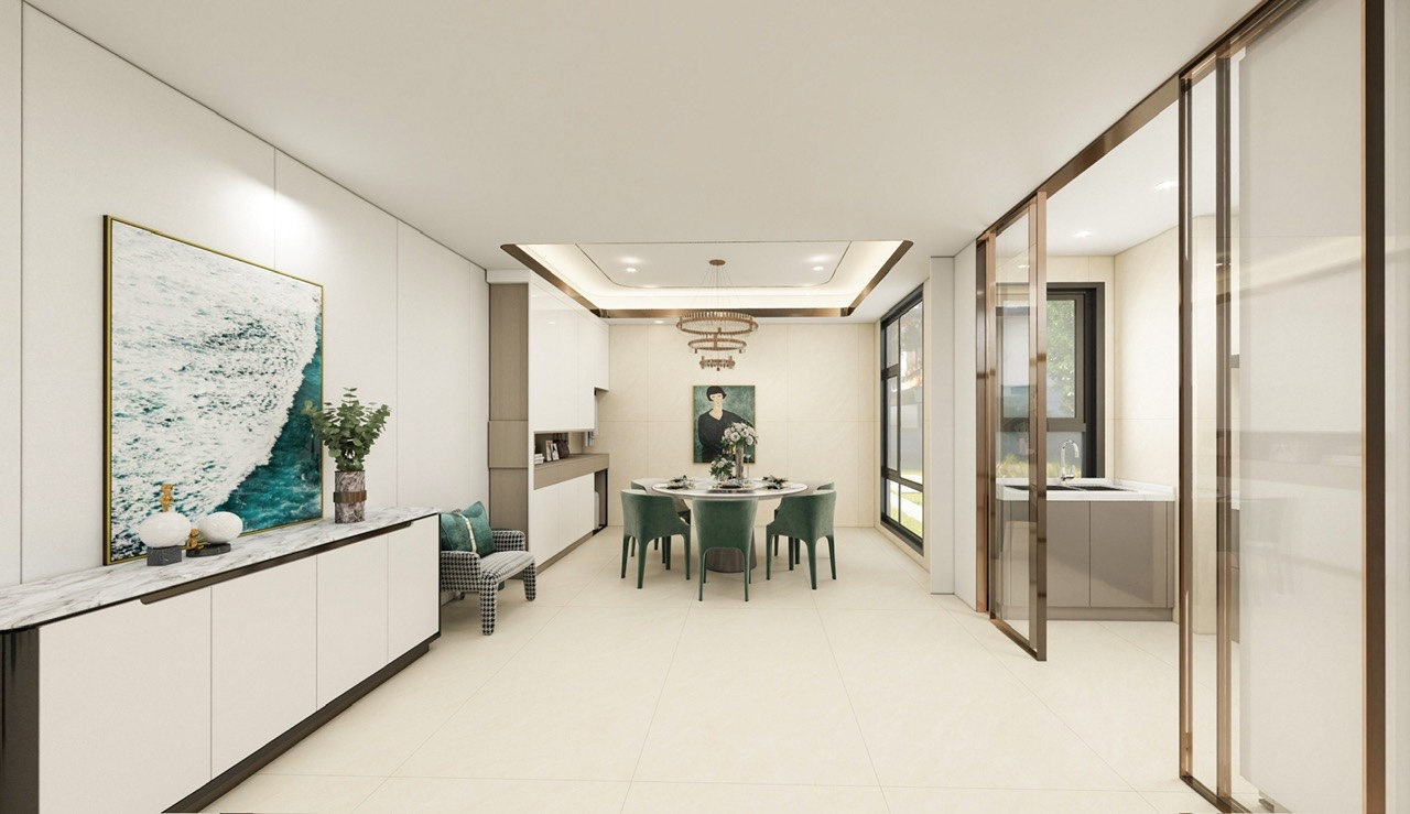 Phòng ngủ – phòng ăn: sắc màu dịu nhẹ giúp gia đình tận hưởng sự ấm áp, thư giãn sau một ngày dài.